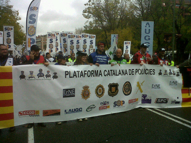 La protesta ha estado presidida por una pancarta con el lema "Trabaja según te pagan, trabaja según te tratan. Por nuestros derechos. Policías de España en conflicto", banderas de todas las comunidades autónomas y divisas del sindicato convocante.
